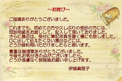 お名前がある場合には直接、そうでなくてもホームページ上でお返事しております。その内容は毎月開催しているクリニック検討会で、スタッフ全員で十分お話し合いさせていただいております。